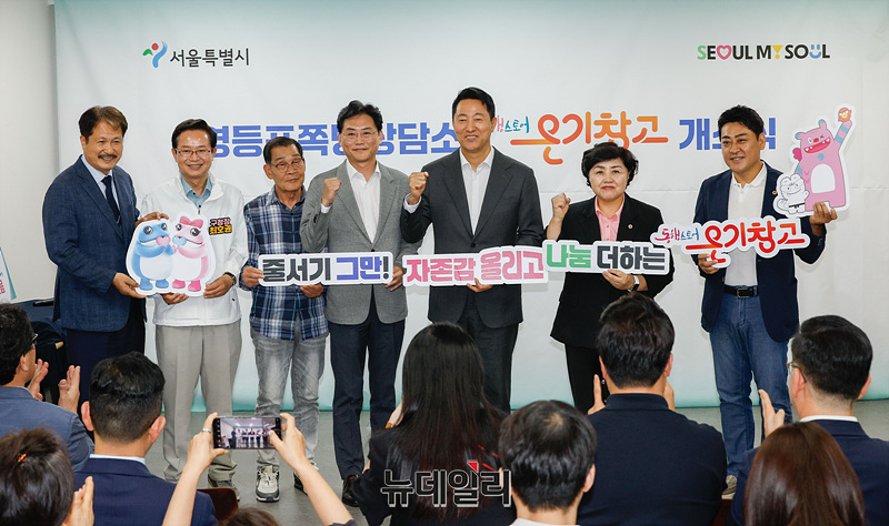 오세훈 서울시장을 비롯한 참석자들이 23일 오전 서울 영등포구 쪽방상담소에서 열린 온기창고 개소식에서 기념촬영을 하고 있다.