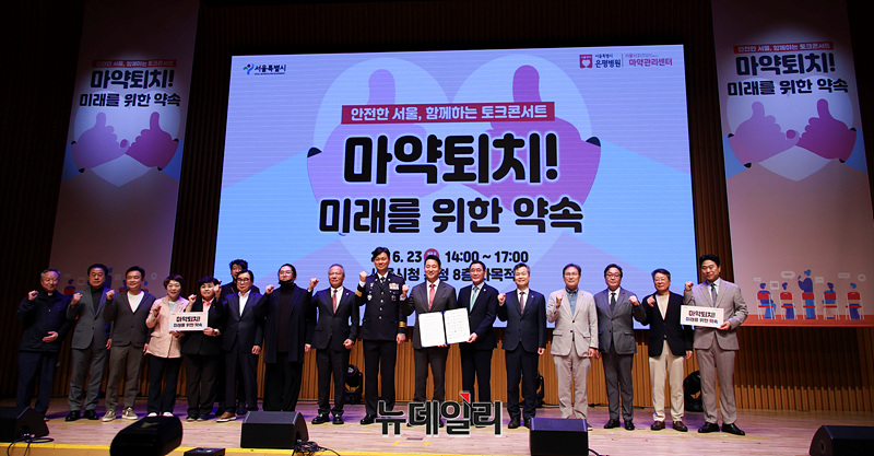 오세훈 서울시장을 비롯한 참석자들이 23일 오후 서울시청에서 열린 '청(소)년 마약 대응 강화를 위한 업무협약식'에서 기념촬영을 하고 있다.