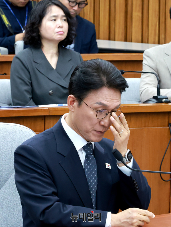 [포토] 안경 고쳐쓰는 김민석 국무총리 후보자