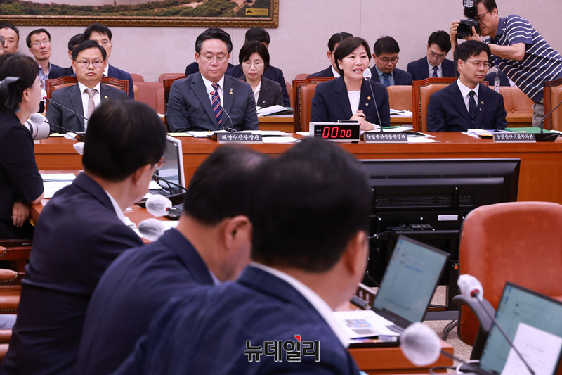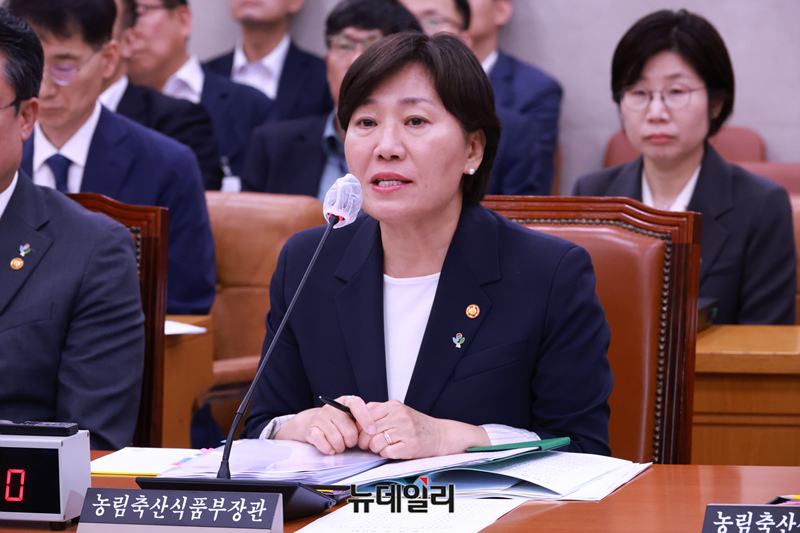 송미령 농림축산식품부 장관이 25일 국회에서 열린 농림축산식품해양수산위원회 전체회의에 출석해 유임관련 입장을 밝히고 있다.
