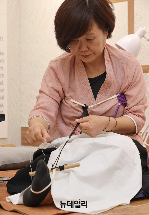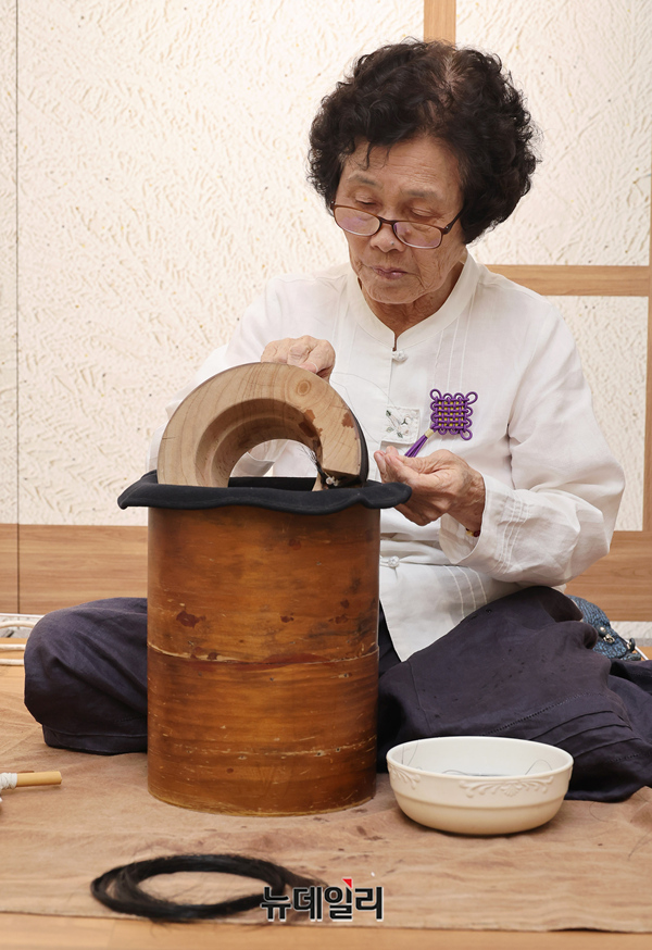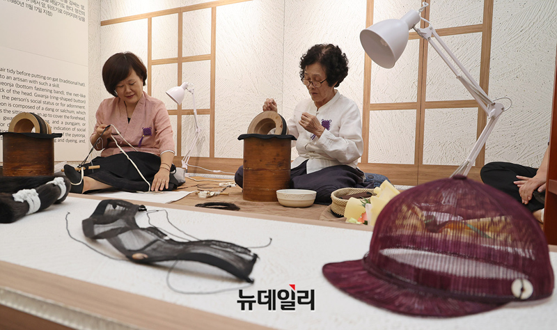 전영인(왼쪽), 강전향 망건장 보유자가 26일 오후 서울 강남구 국가무형유산전수교육관에서 열린 '2025년 국가무형유산 기능 보유자 합동 공개행사'에서 망건장 제작 시연을 하고 있다.망건은 말총과 인모를 재료로 사용하는데 말총을 주로 사용하며, 헌망건을 수리할 때는 인모를 사용한다.기능 종목 보유자 합동 공개행사는 갓일 등 기능 10종목, 보유자 13명의 공개 시연과 작품 전시, 체험 등으로 꾸며졌다.6월 26일 개막식을 시작으로 7월 12일까지 매주 목, 금, 토요일 오전 10시부터 오후 5까지 국가무형유산전수교육관 별관 3층 전시관 올에서 진행된다.