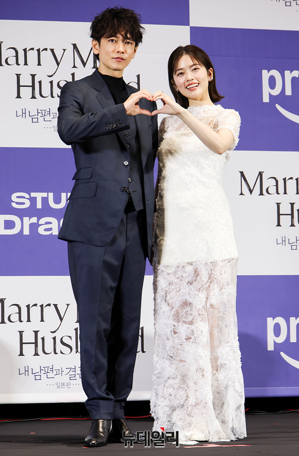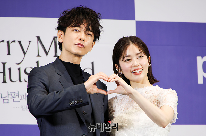 일본배우 사토 타케루, 코시바 후우카가 26일 오후 서울 구로구 라마다 신도림 호텔에서 열린 일본판 '내 남편과 결혼해줘' 제작발표회에서 포즈를 취하고 있다.
