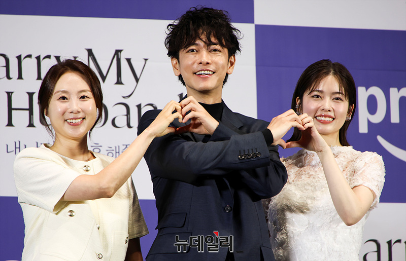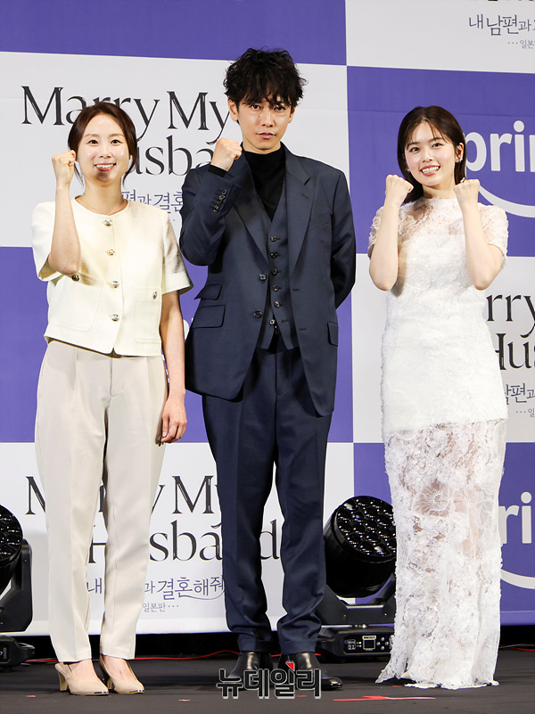 손자영 책임프로듀서와 배우 사토 타케루, 코시바 후우카가 26일 오후 서울 구로구 라마다 신도림 호텔에서 열린 일본판 '내 남편과 결혼해줘' 제작발표회에서 포즈를 취하고 있다.