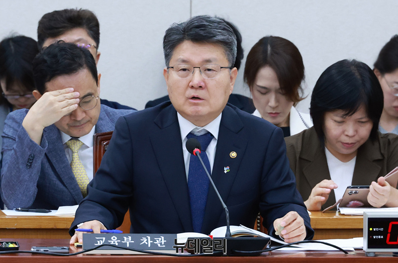 오석환 교육부 차관이 27일 오전 국회에서 열린 2025년도 제2회 추가경정예산안 관련 교육위원회 전체회의에서 의원들의 질의에 답하고 있다.