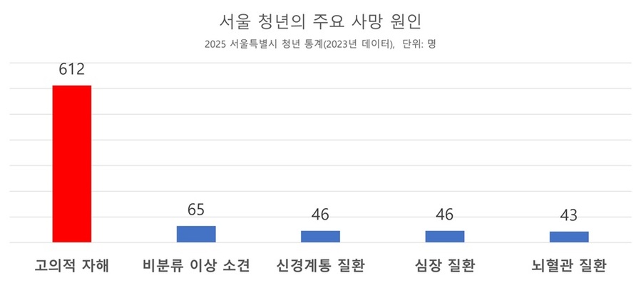 ◆ 청년 유입 도시 서울, 일부에겐 자살의 배경이 되기도 했다가장 눈에 띄는 통계는 사망 원인이었다.2023년 서울에서 사망한 청년은 총 1260명. 이 가운데 절반에 가까운 612명(48.6%)이 고의적 자해, 즉 자살로 목숨을 끊었다.나머지 주요 사망 원인은 '달리 분류되지 않은 증상·징후 및 임상 이상소견' 65명, 신경계통 질환 46명, 기타 심장 질환 46명, 뇌혈관 질환 43명 등으로 자살이 단일 원인으로는 단연 압도적인 수치를 기록했다.서울은 청년을 불러들이는 도시지만, 일부에게는 극단적인 선택으로 내몰리는 배경이 되기도 한다는 분석이 더해졌다.이삼식 한양대 정책학과 교수는 "지방에서 서울로 유입된 청년들은 대부분 자취 생활을 하며 고립되기 쉽다"고 진단했다.혼자 감당해야 하는 생활비와 주거비 부담, 서울 특유의 치열한 경쟁 환경은 청년들을 일상 속에서 점점 더 고립된 상태로 몰아넣는다.이 교수는 "겉으로는 활기차게 살아가는 것처럼 보여도 정서적으로는 지지 기반 없이 외로운 시간을 보내는 경우가 많다"며 "이런 구조가 반복될수록 극단적인 선택의 위험도 함께 높아진다"고 말했다.