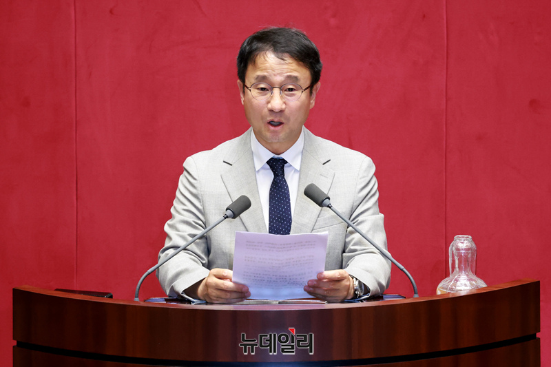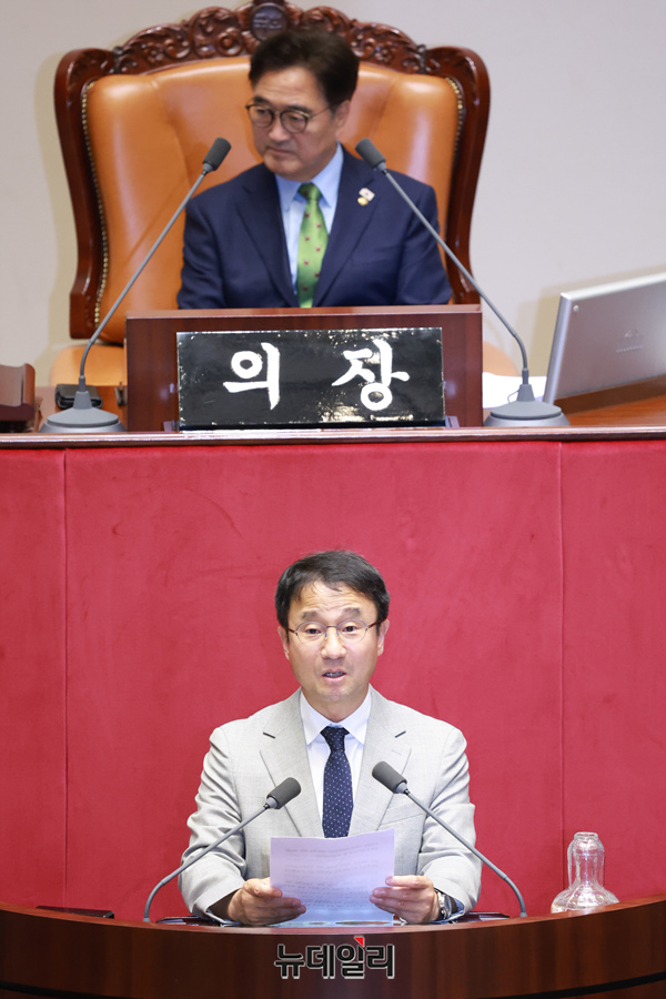 국회 예산결산특별위원회 위원장으로 선출된 한병도 더불어민주당 의원이 27일 오후 국회에서 열린 본회의에서 당선 인사말을 하고 있다.