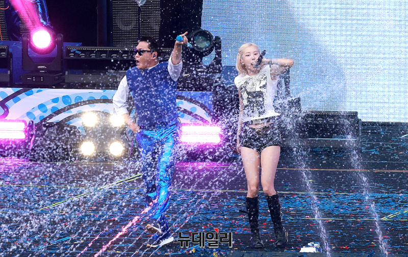 가수 로제가 28일 오후 인천 서구 인천아시아드 주경기장에서 열린 '싸이 흠뻑쇼 SUMMER SWAG 2025'에 게스트로 참석해 가수 싸이와 함께 무대하고 있다. (인천=이종현 기자)