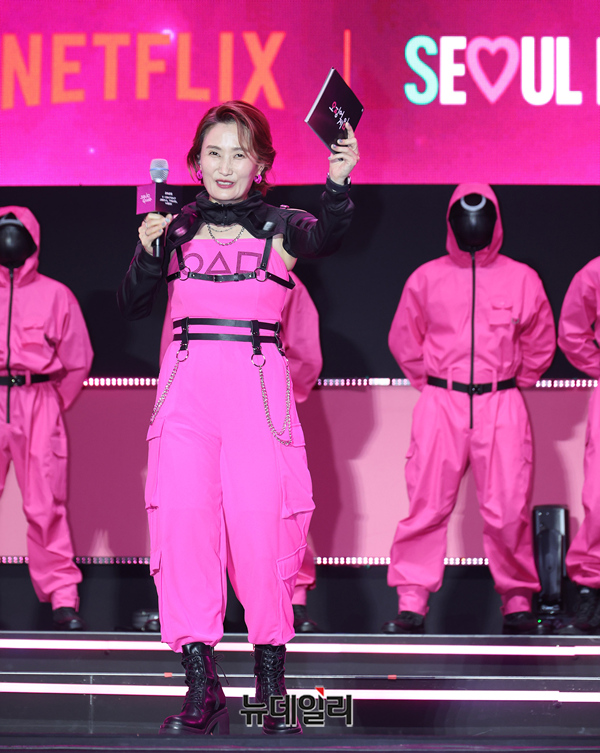방송인 박경림이 28일 오후 서울 중구 서울광장에서 열린 넷플릭스 '오징어 게임' 팬이벤트 무대에서 사회를 맡아 배우를 소개하고 있다.이날 팬이벤트에는 황동혁 감독을 비롯해 배우 이정재, 이병헌 , 임시완, 강하늘, 위하준, 박규영, 이진욱, 박성훈, 양동근, 강애심, 조유리, 채국희, 이다윗, 노재원, 전석호, 최승현, 이서환, 원지안, 김법래, 김시은, 박해수, 정호연, 김주령, 아누팜 트리파티, 이유미 등 오징어게임 출연자들이 함께했다.오징어 게임 시즌3 피날레는 넷플릭스와 서울시가 공동주최하는 '2025 K콘텐츠 서울여행주간 오징어 게임 퍼레이드’ 행사로 세종대로 일대에서 진행됐다.오징어게임 시즌3는 자신만의 목적을 품고 다시 참가한 게임에서 가장 친한 친구를 잃고만 ‘기훈’과, 정체를 숨긴 채 게임에 숨어들었던 ‘프론트맨’, 그리고 그 잔인한 게임 속에서 살아남은 참가자들의 마지막 운명을 그린 이야기다.