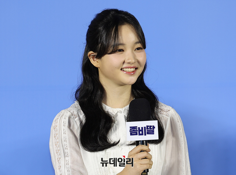 배우 최유리가 30일 오전 서울 CGV용산아이파크몰에서 열린 영화 ‘좀비딸(감독 필감성)’ 제작보고회에서 인사말을 하고 있다.