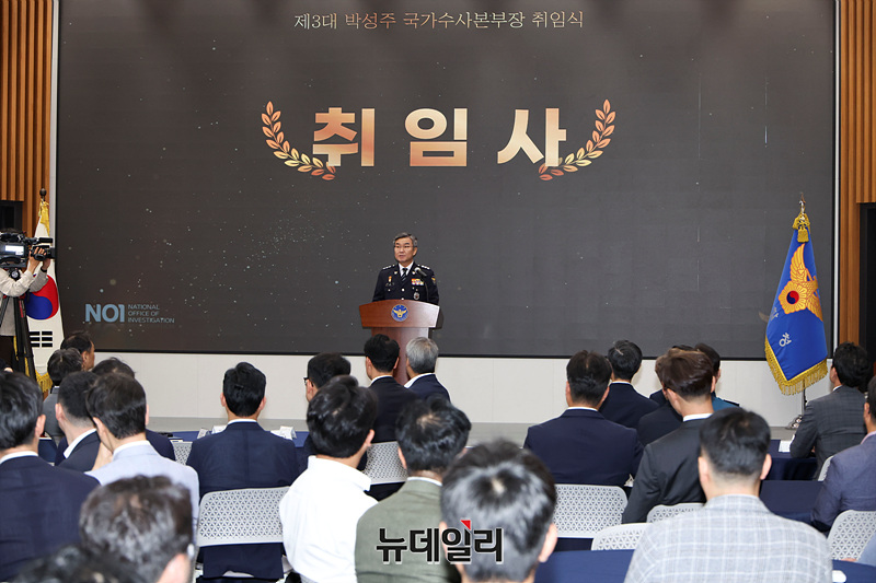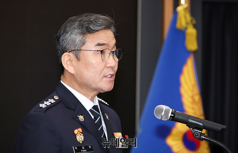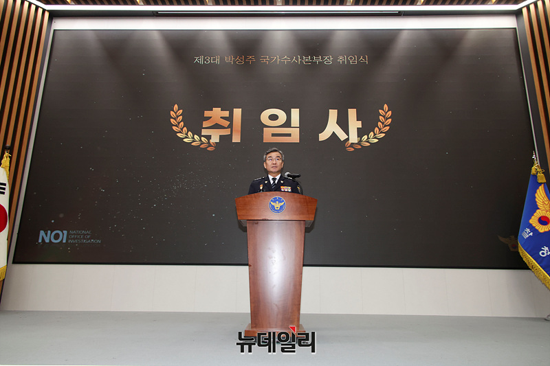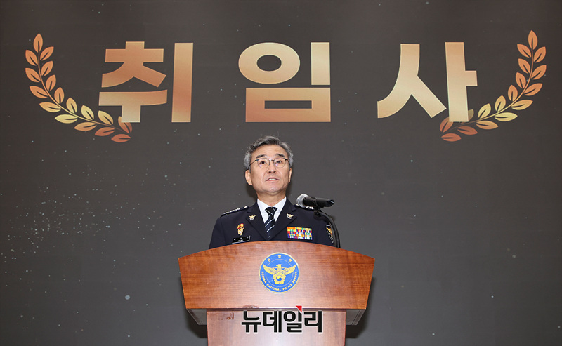 박성주 신임 국가수사본부장이 30일 오후 서울 서대문구 경찰청에서 열린 제3대 국가수사본부장 취임식에서 취임사를 하고 있다.