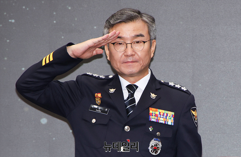 박성주 신임 국가수사본부장이 30일 오후 서울 서대문구 경찰청에서 열린 제3대 국가수사본부장 취임식에서 취임사를 마치고 경례하고 있다.