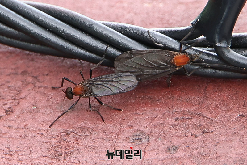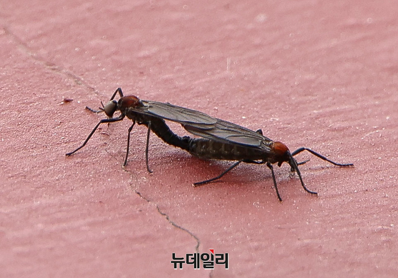전국 곳곳에 '러브버그'로 불리는 붉은등우단털파리가 출몰하는 가운데 1일 오전 서울 종로구 북악산에서 러브버그 한쌍이 기어다니고 있다.2022년부터 서울 서북부를 중심으로 수도권에서 떼를 지어 출현하기 시작한 러브버그(붉은등우단털파리)는 6월 말부터 7월 초까지 성충으로 집단 출몰한다.암수 한 쌍이 붙어 다니며 사람과 차량, 건물에 달라붙어 불쾌감과 안전 문제를 유발하고 사체 내장의 산성으로 인해 자동차와 건축물 부식 등 피해를 초래하고 있다.