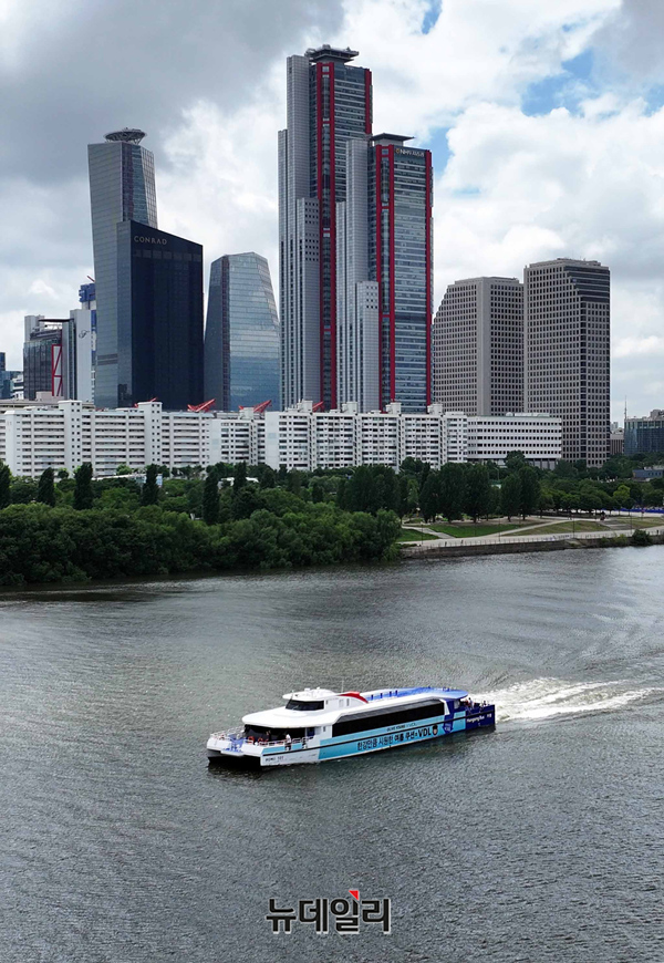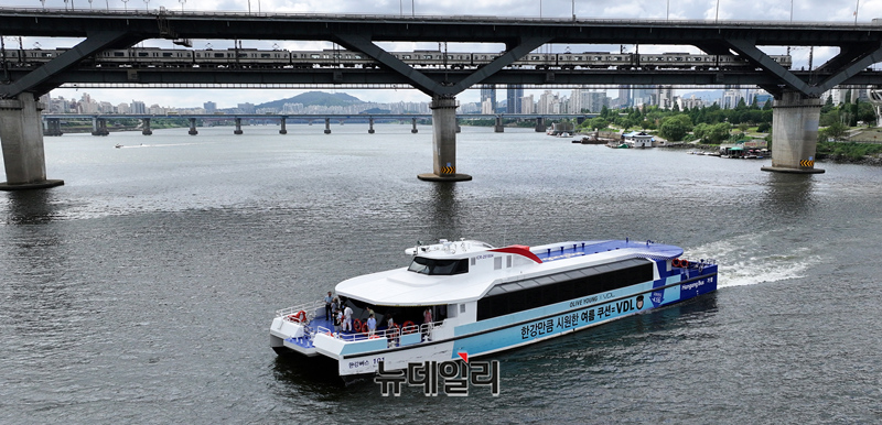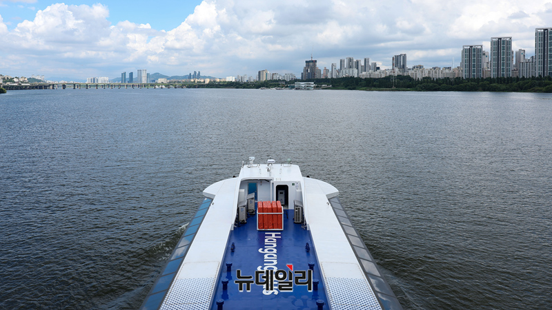 시민 체험 시범운행을 시작한 서울시 한강버스가 1일 오후 여의도 선착장을 출발해 한강을 지나고 있다.