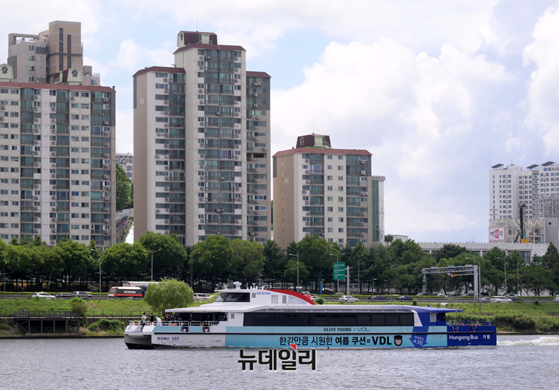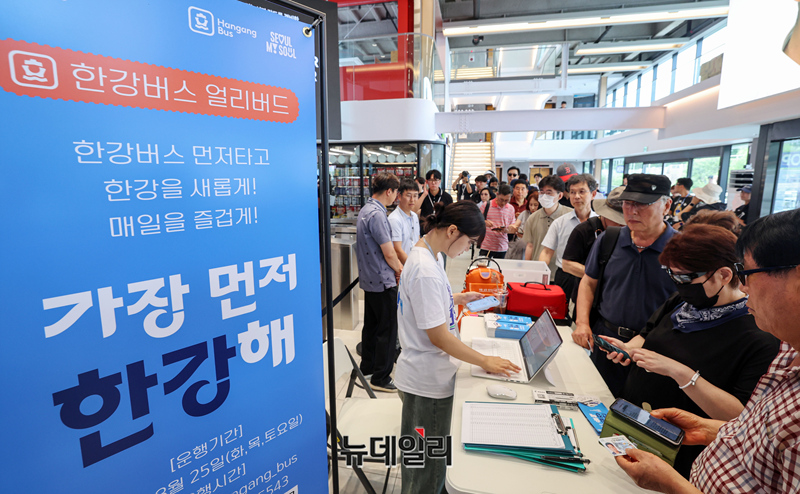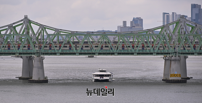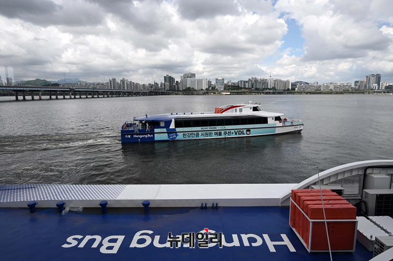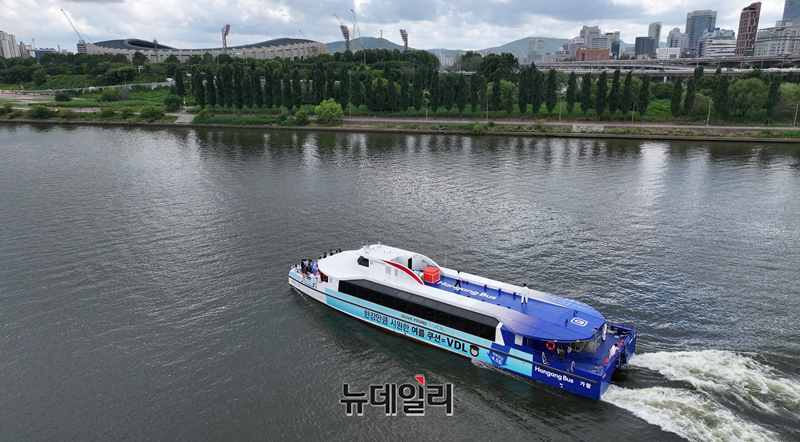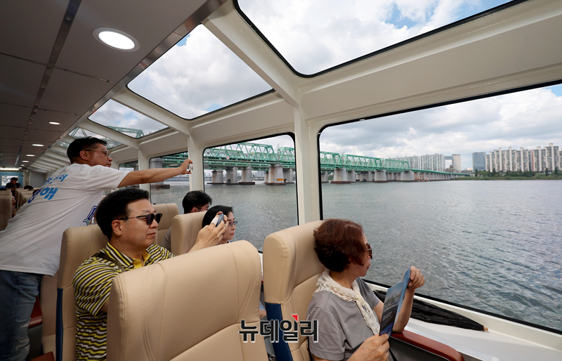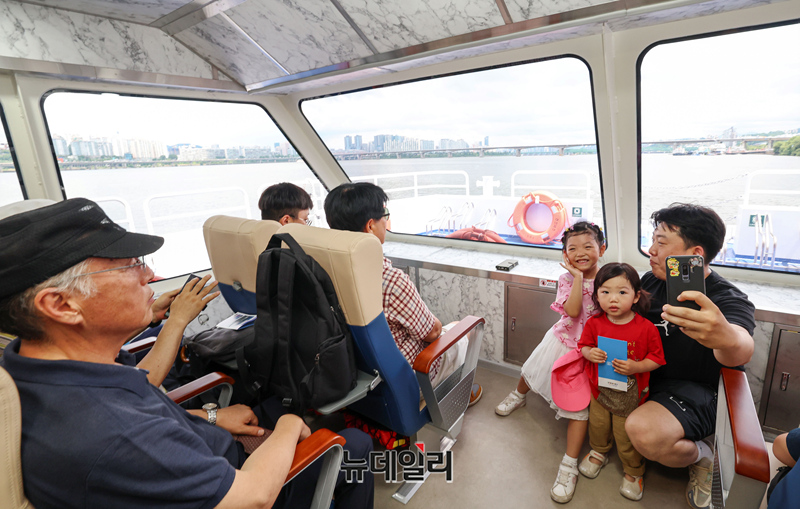 시민 체험 시범운행을 시작한 서울시 한강버스에 탑승한 시민들이 1일 오후 여의도 선착장을 출발해 한강을 지나고 있다.