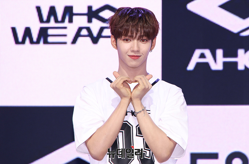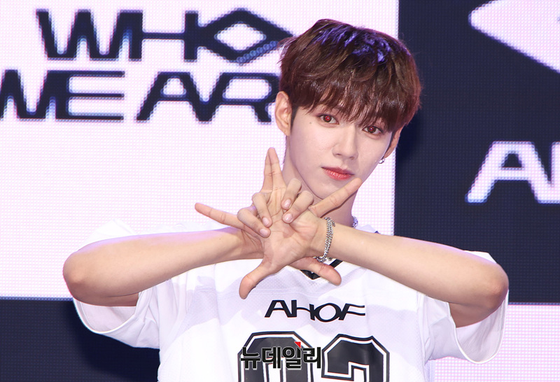 보이그룹 아홉(AHOF) 제이엘이 1일 오후 서울 광진구 예스24 라이브홀에서 열린 첫 번째 미니앨범 '후 위 아(WHO WE ARE)' 데뷔 쇼케이스에서 포즈를 취하고 있다.