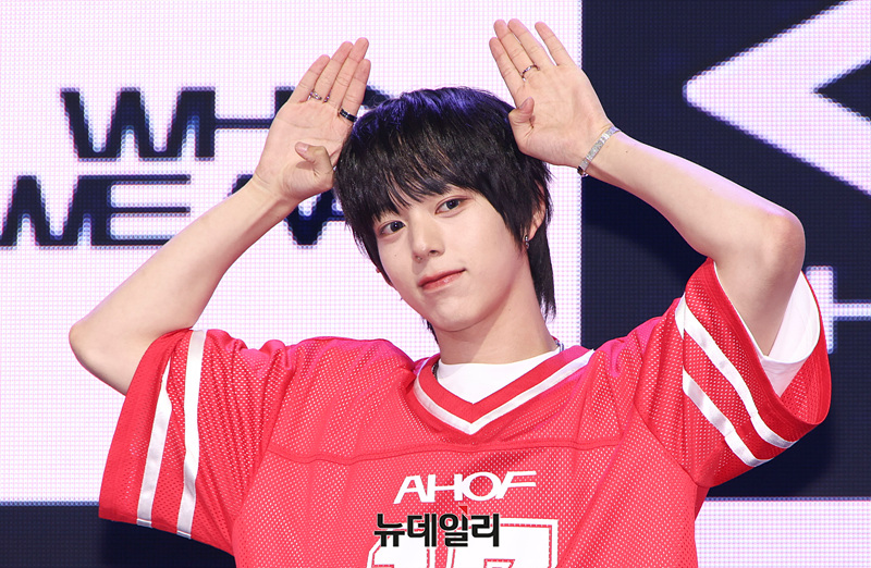 보이그룹 아홉(AHOF) 즈언이 1일 오후 서울 광진구 예스24 라이브홀에서 열린 첫 번째 미니앨범 '후 위 아(WHO WE ARE)' 데뷔 쇼케이스에서 포즈를 취하고 있다.