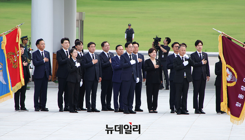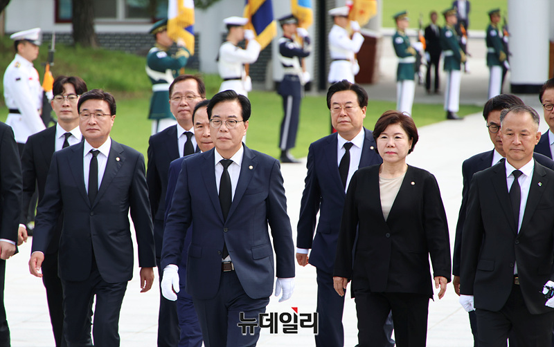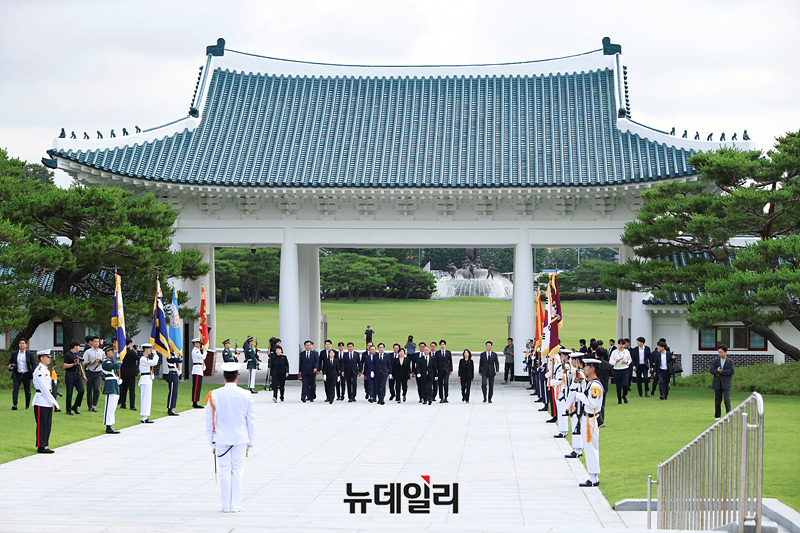 송언석 국민의힘 비상대책위원장 겸 원내대표와 지도부가 2일 오전 서울 동작구 국립현충원에서 현충탑을 향해 이동하고 있다.