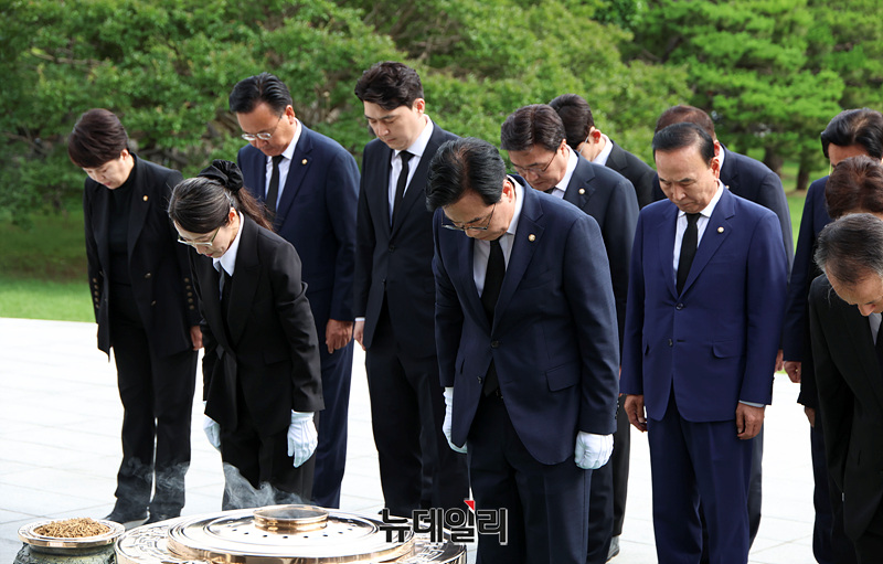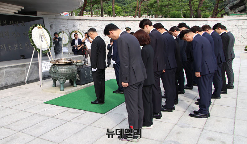 송언석 국민의힘 비상대책위원장 겸 원내대표를 비롯한 지도부가 2일 오전 서울 동작구 국립현충원 현충탑에서 참배하고 있다.