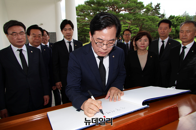 송언석 국민의힘 비상대책위원장 겸 원내대표가 2일 오전 서울 동작구 국립현충원에서 참배를 마치고 방명록을 작성하고 있다.