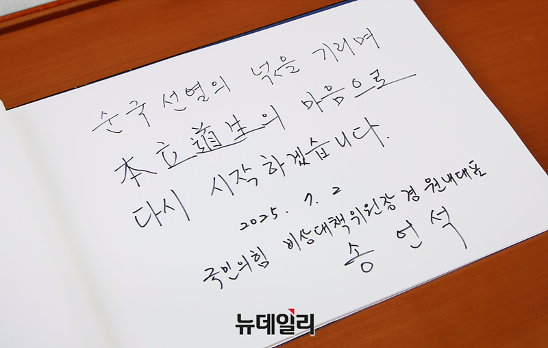 [포토] 방명록 작성하는 송언석 비대위원장