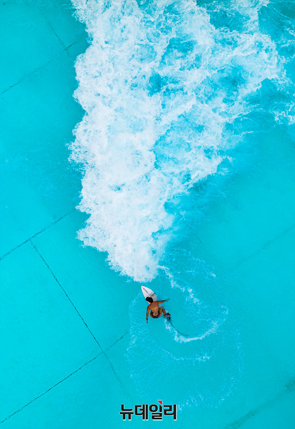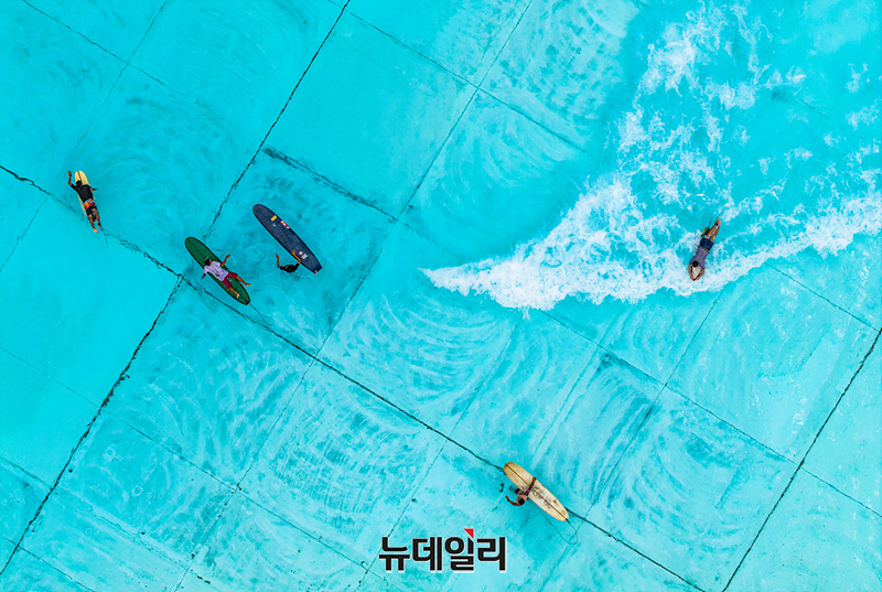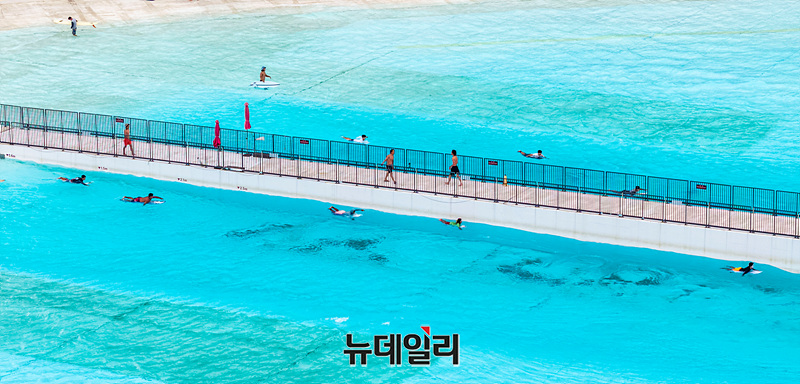 전국 대부분 지역에 폭염특보가 발효된 2일 오후 경기 시흥시에 위치한 한 인공서핑파크에서 서퍼들이 파도를 타며 더위를 식히고 있다.