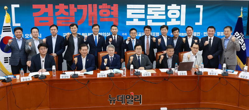민형배, 박찬대, 정청래 더불어민주당 의원 등 참석자들이 2일 오후 국회에서 열린 검찰개혁 토론회에서 기념촬영을 하고 있다.