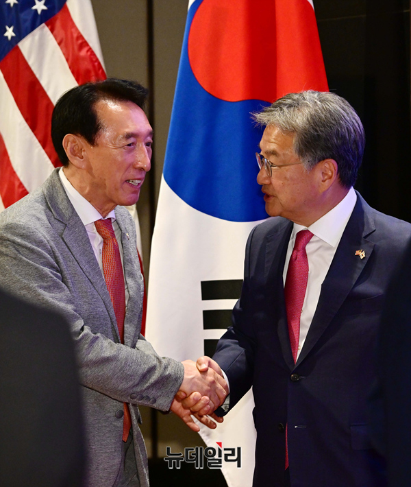 조셉 윤 주한 미국대사대리와 김석기 국회 외교통일위원회 위원장이 2일 오후 서울 용산구 그랜드 하얏트 호텔 그랜드 볼룸에서 열린 미국 독립기념일 행사에서 기념촬영을 하고 있다. (사진=공동취재단)