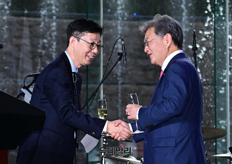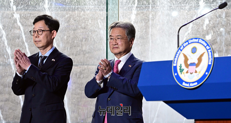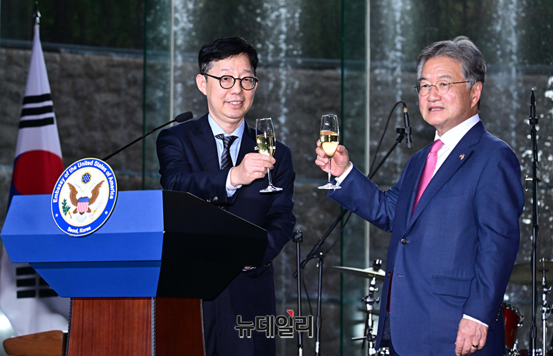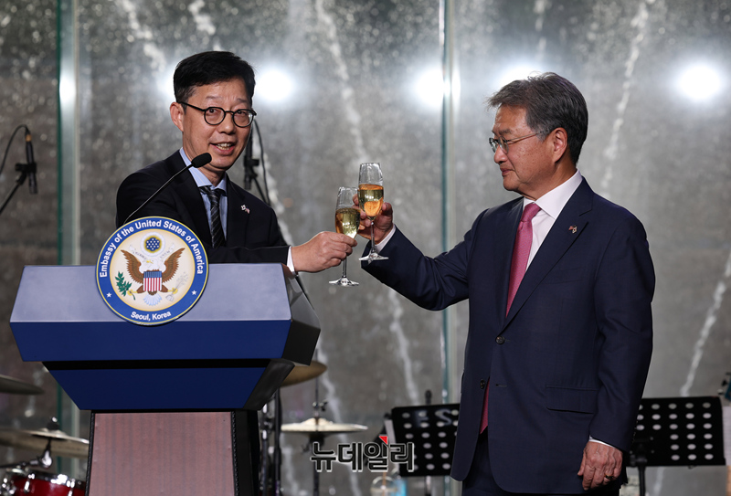 조셉 윤 주한 미국대사대리와 박윤주 외교부 1차관이 2일 오후 서울 용산구 그랜드 하얏트 호텔 그랜드 볼룸에서 열린 미국 독립기념일 행사에서 건배를 하고 있다. (사진=공동취재단)