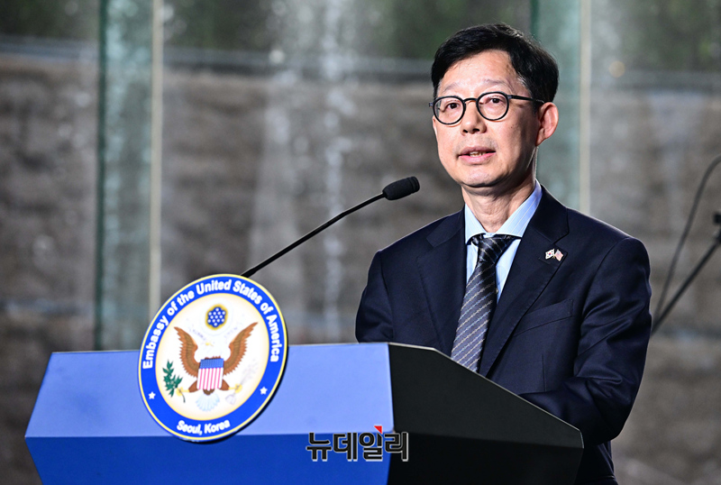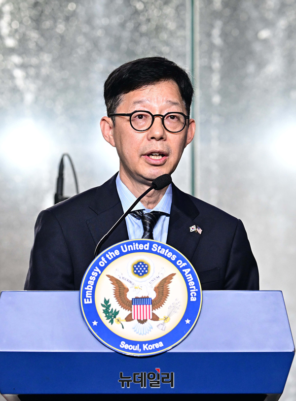 박윤주 외교부 1차관이 2일 오후 서울 용산구 그랜드 하얏트 호텔 그랜드 볼룸에서 열린 미국 독립기념일 행사에서 축사를 하고 있다. (사진=공동취재단)