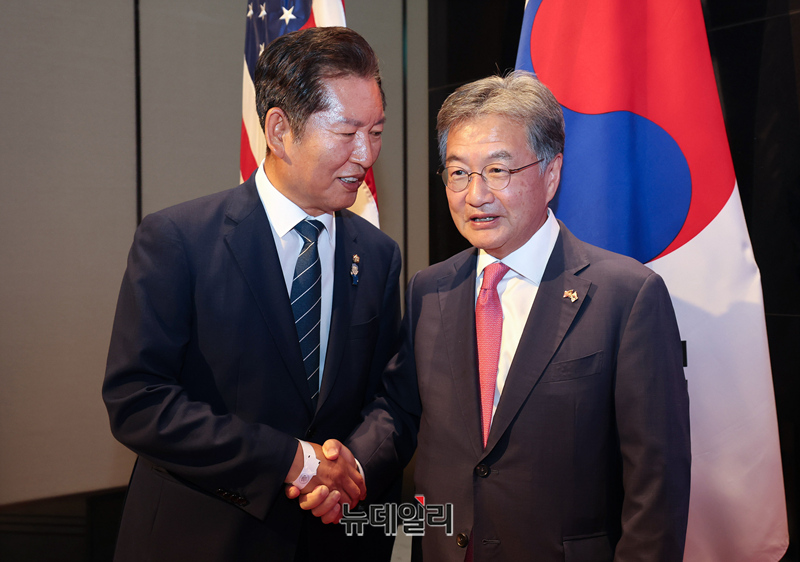 조셉 윤 주한 미국대사대리(왼쪽)와 정청래 더불어민주당 의원이 2일 오후 서울 용산구 그랜드 하얏트 호텔 그랜드 볼룸에서 열린 미국 독립기념일 행사에서 이야기를 나누고 있다. (사진=공동취재단)