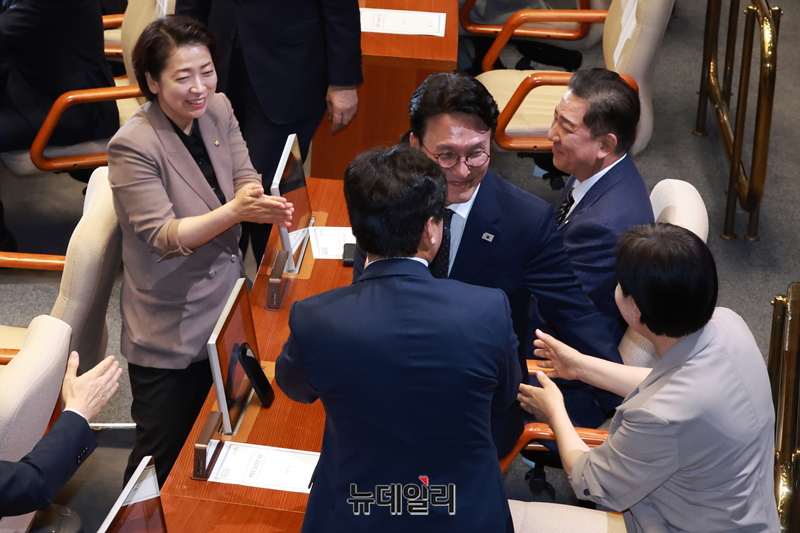 김민석 국무총리 후보자가 3일 오후 국회에서 열린 본회의에서 자신의 임명동의안이 가결된 후 의원들에게 축하를 받고 있다.