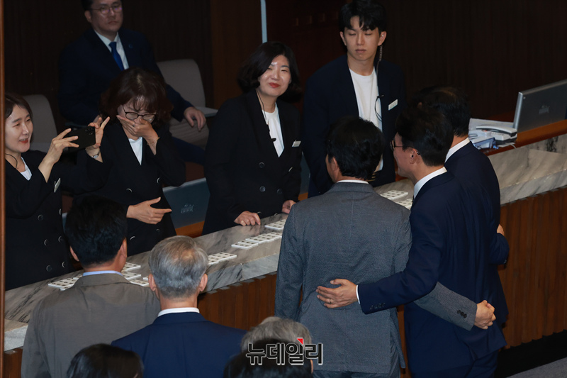 김민석 국무총리 후보자가 3일 오후 국회에서 열린 본회의에서 자신의 임명동의안에 투표하는 의원들과 사진을 찍고 있다.