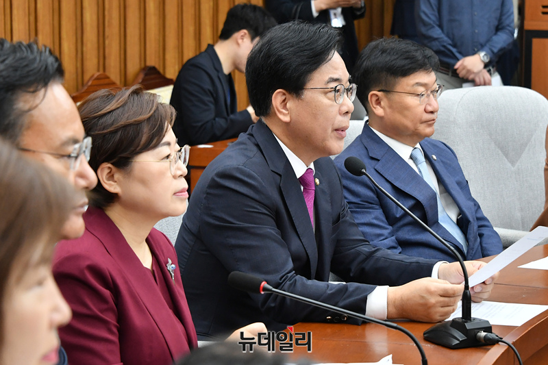 송언석 국민의힘 비상대책위원장 겸 원내대표가 8일 오전 국회에서 열린 원내대책회의에서 모두발언을 하고 있다.