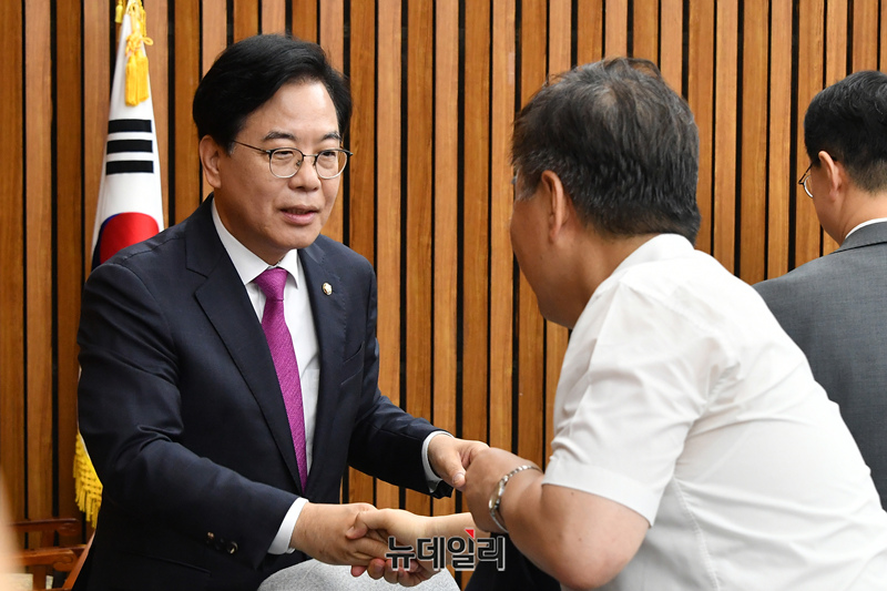 송언석 국민의힘 비상대책위원장 겸 원내대표와 지도부가 8일 오전 국회에서 열린 원내대책회의에 참석하고 있다.