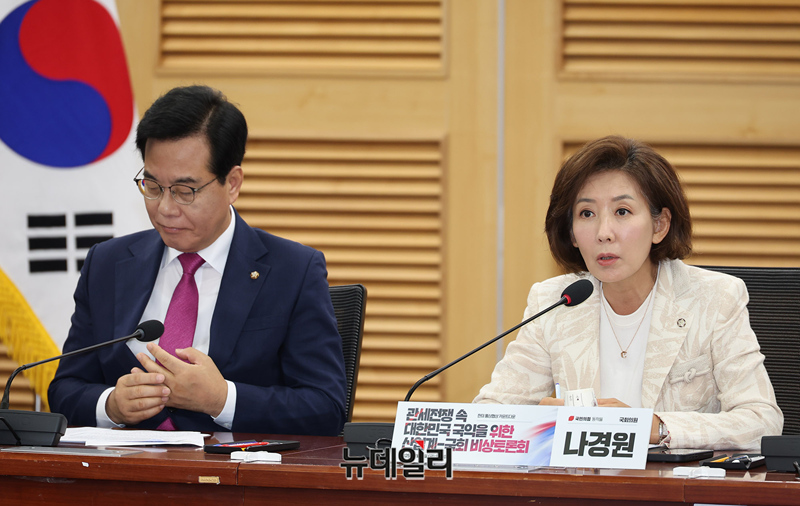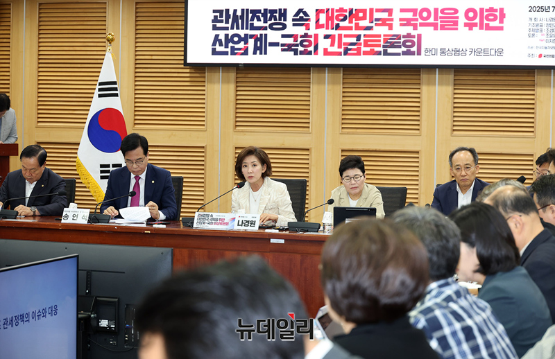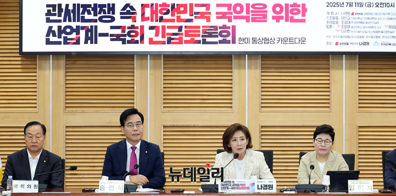 토론회를 공동주최한 나경원 국민의힘 의원이 11일 오전 국회 의원회관에서 열린 '한미 통상협상 카운트다운 : 관세전쟁 속 대한민국 국익을 위한 산업계-국회 비상토론회'에서 개회사를 하고 있다.