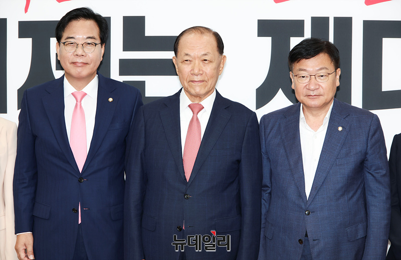 송언석 국민의힘 비상대책위원장 겸 원내대표와 황우여 선거관리위원장을 비롯한 참석자들이 14일 오전 국회에서 열린 당 대표 및 최고위원 선출 선거관리위원회 위촉장 수여식에서 기념촬영을 하고 있다.