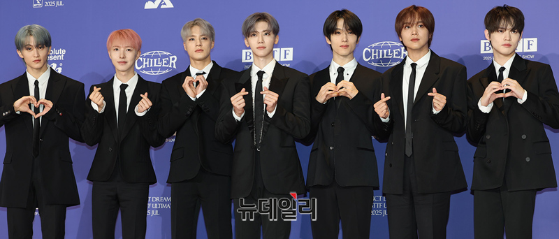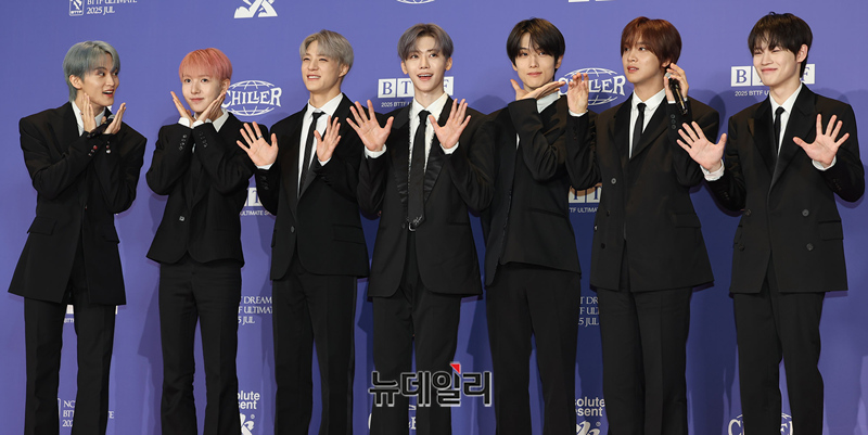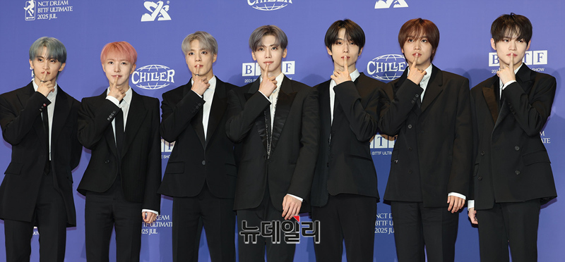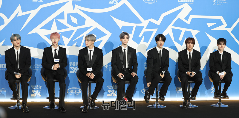 NCT DREAM이 14일 오전 서울 송파구 롯데시네마 월드타워에서 열린 정규 5집 'Go Back To The Future' 제작발표회에 앞서 포토타임을 갖고 있다.