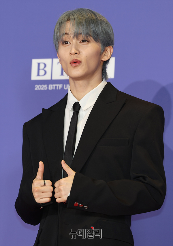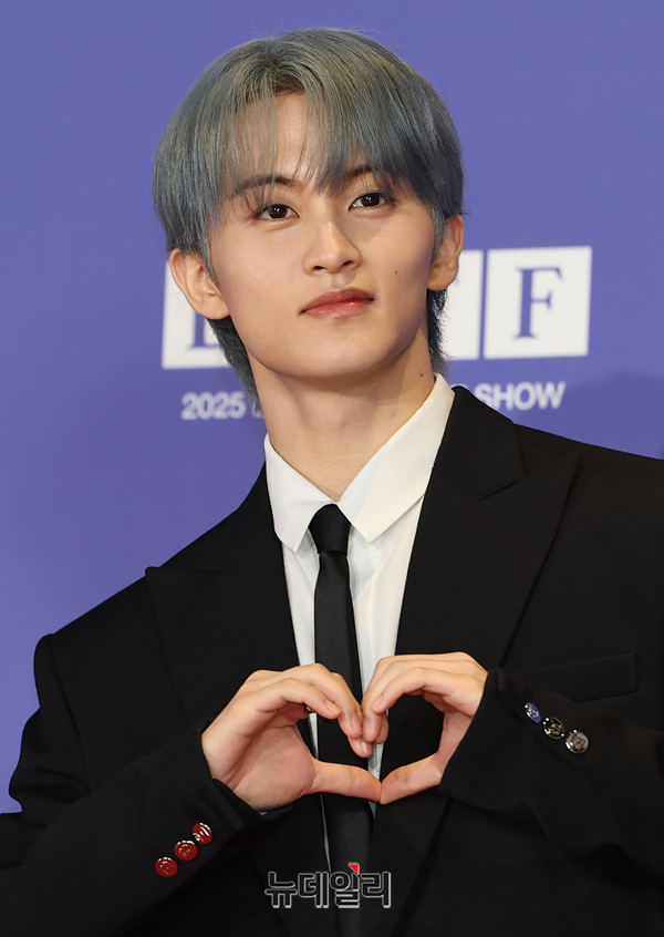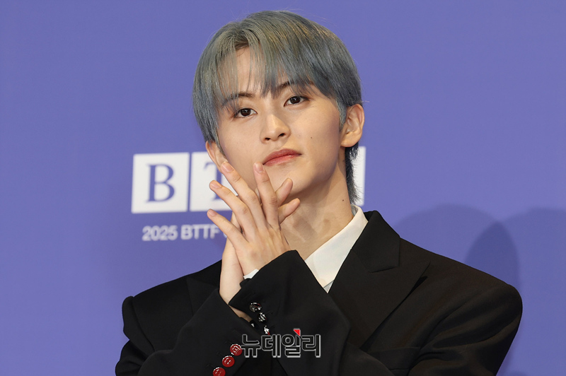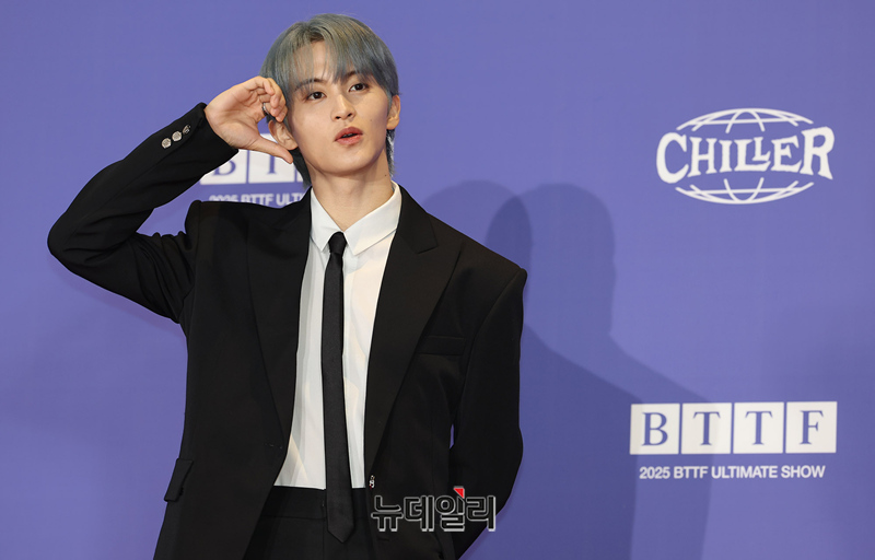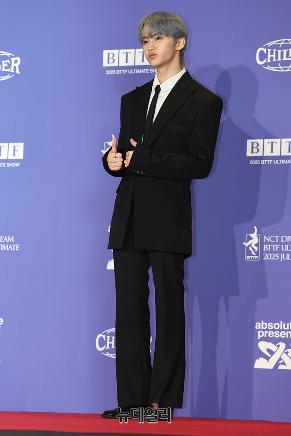 NCT DREAM 리더 마크가 14일 오전 서울 송파구 롯데시네마 월드타워에서 열린 정규 5집 'Go Back To The Future' 제작발표회에 앞서 포토타임을 갖고 있다.