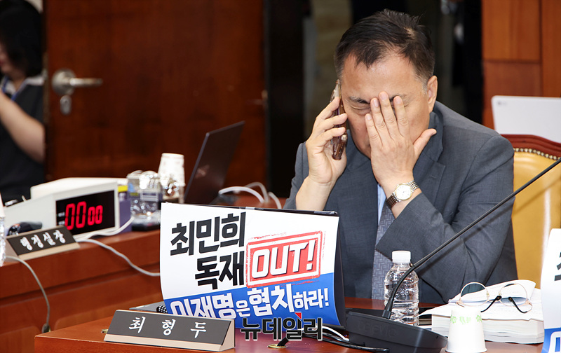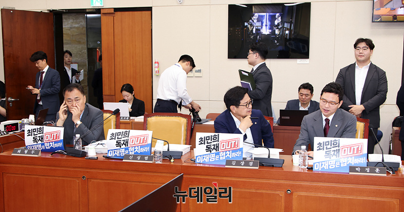 최형두 과방위 국민의힘 간사를 비롯한 의원들이 14일 오전 국회 과학기술정보방송통신위원회 전체회의장에서 열린 배경훈 과기부 장관 후보자 인사청문회에서 최민희 위원장을 비판하는 문구가 적힌 피켓을 붙이고 자리하고 있다.