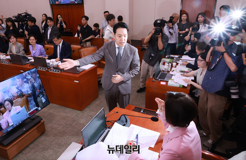 더불어민주당 간사인 김한규 의원과 국민의힘 간사인 조은희 의원이 14일 국회 여성가족위원회에서 열린 강선우 여성가족부 장관 후보자 인사청문회에서 의사진행발언 관련해 이인선 위원장에게 항의하고 있다.