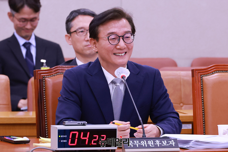 전재수 해양수산부 장관 후보자가 14일 오전 국회 농림축산식품해양수산위원회에서 열린 인사청문회에서 의원들의 질문에 환하게 웃고 있다.