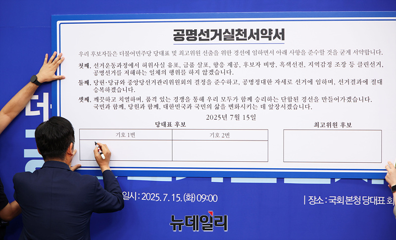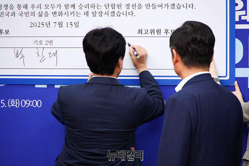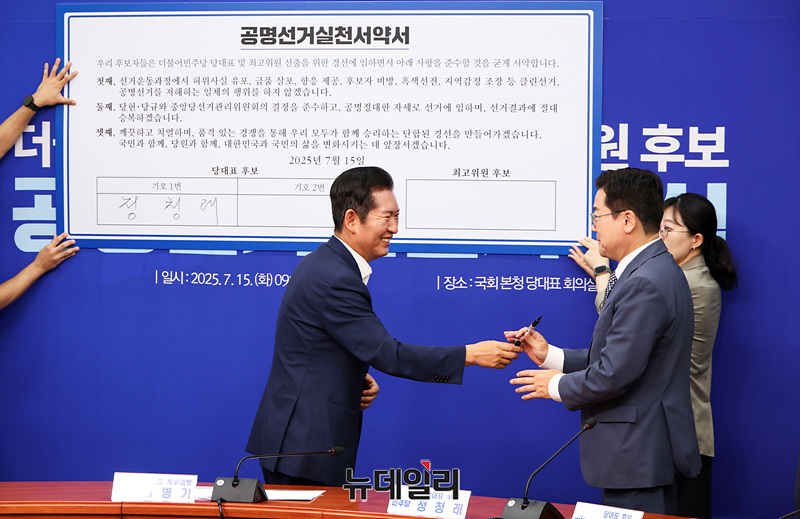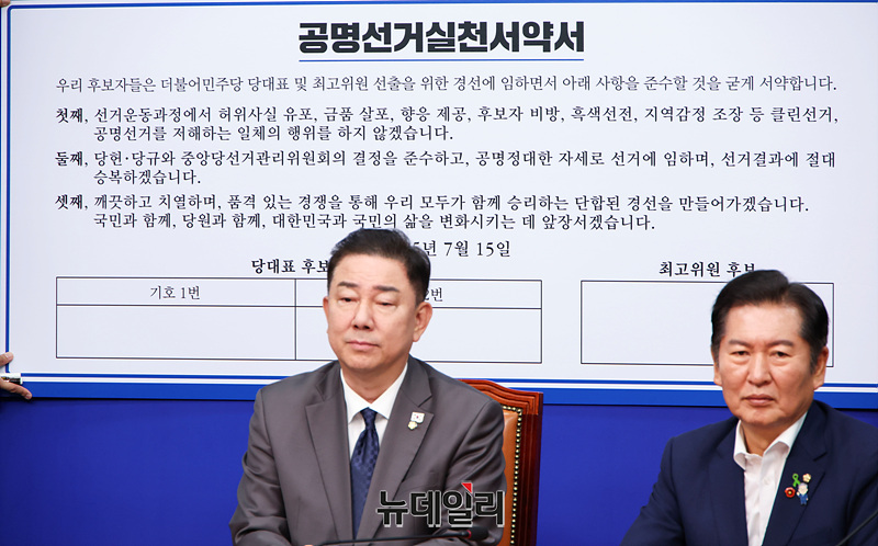 김병기 더불어민주당 당대표 직무대행 겸 원내대표와 정청래, 박찬대 당대표 후보, 황명선 최고위원 후보가 15일 오전 국회에서 열린 공명선거실천서약식에서 서명을 하고 있다.
