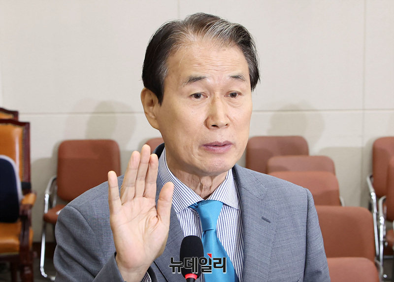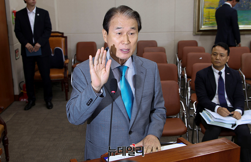 권오을 국가보훈부 장관 후보자가 15일 오전 국회 정무위원회 전체회의장에서 열린 인사청문회에서 선서를 하고 있다.