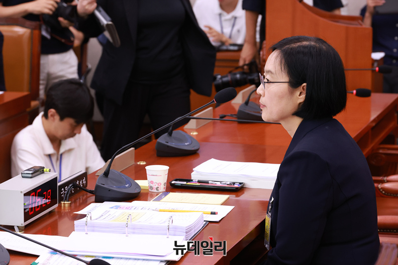 한성숙 중소벤처기업부 장관 후보자가 15일 오전 국회 산업통산자원중소벤처기업위원회에서 열린 인사청문회에서 의원들의 질의를 듣고 있다.