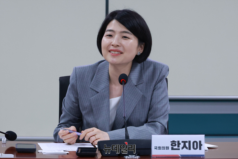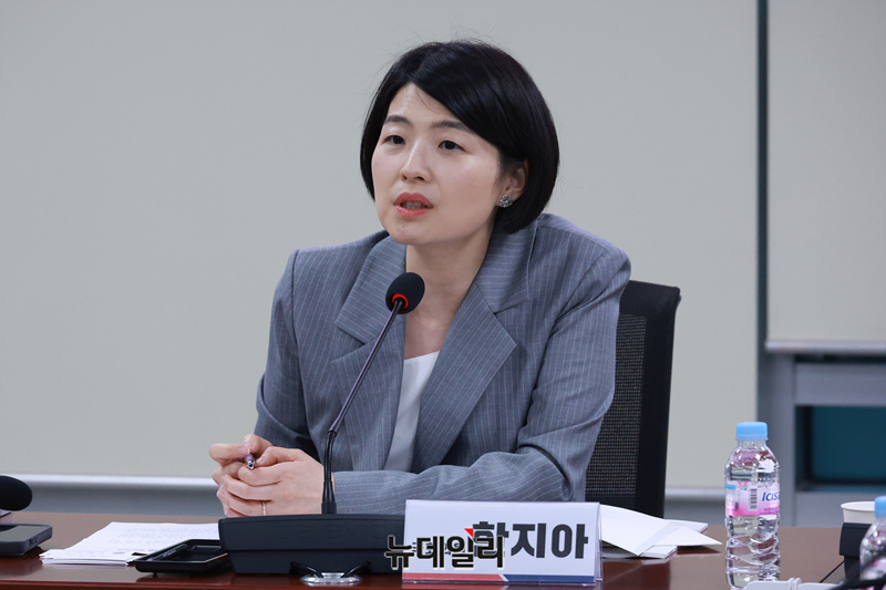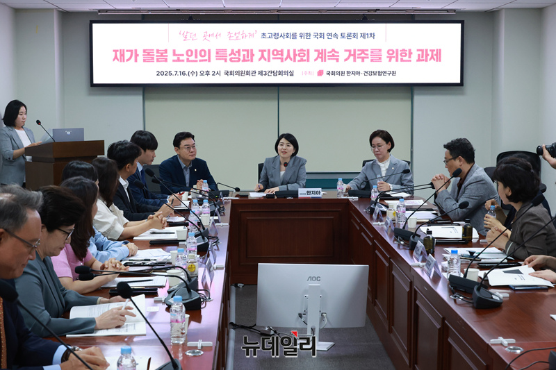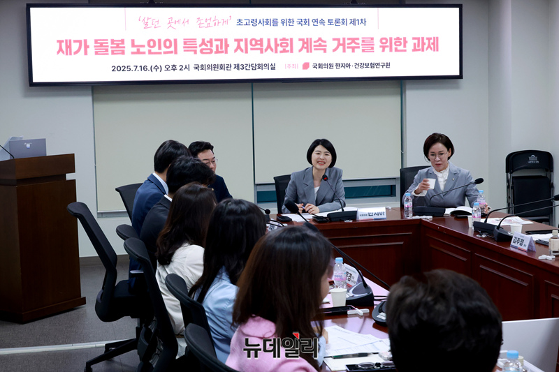한지아 국민의힘 의원이 16일 오후 국회 의원회관에서 '살던 곳에서 존엄하게' 재가 돌봄 노인의 특성과 지역사회 계속 거주를 위한 과제 : 초고령사회를 위한 국회 연속 토론회에서 인사말을 하고 있다.