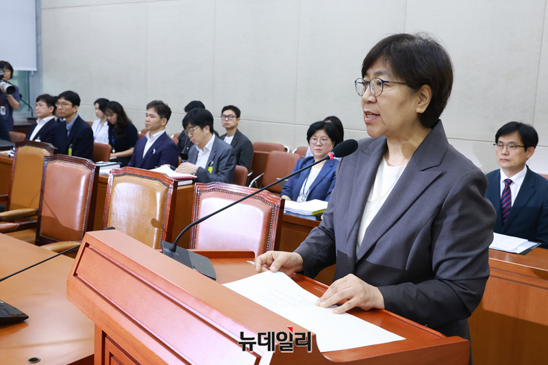 정은경 보건복지부 장관 후보자가 18일 오전 국회 보건복지위원회에서 열린 인사청문회에서 모두발언을 하고 있다.