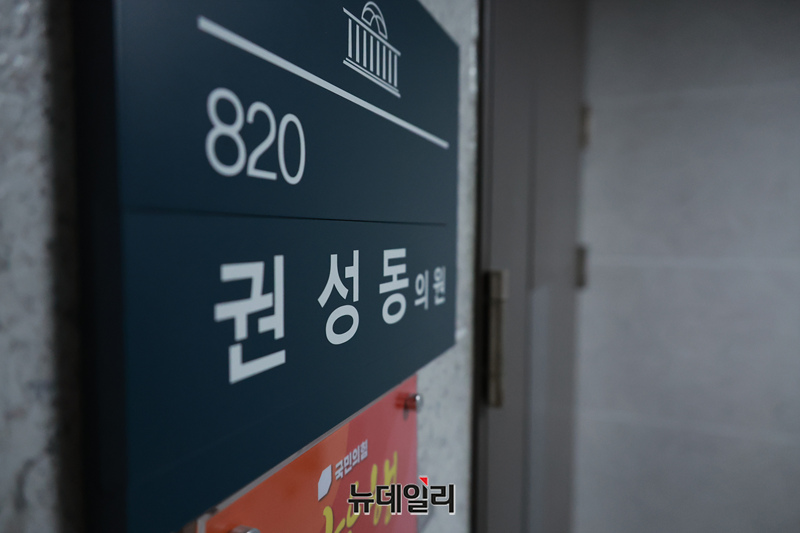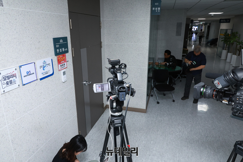 건진법사 전성배 씨의 이권 개입 의혹 등을 수사 중인 김건희 특검팀이 권성동 국민의힘 의원 사무실 압수수색에 나선 18일 오전 국회 권 의원실 앞에서 기자들이 취재를 하고 있다.