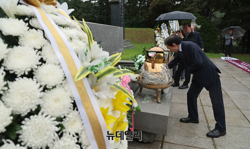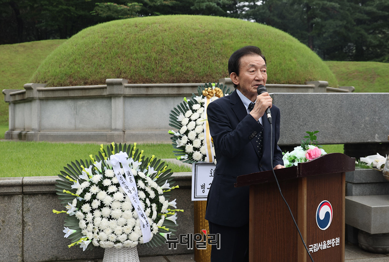 변정일 이승만바로알기국민연합 대표가 19일 오전 서울 동작구 국립서울현충원 이승만대통령 묘역에서 열린 건국대통령 이승만 대통령 서거 60주기 행사에서 헌화하고 있다.