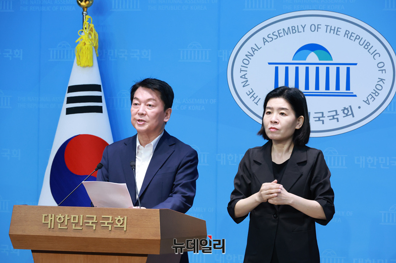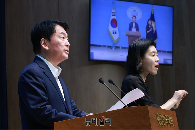 안철수 국민의힘 의원이 21일 오전 국회 소통관에서 기자회견을 갖고 "친길(친전한길) 당대표를 막아달라"고 호소하고 있다.