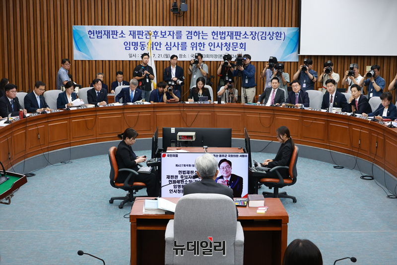 김상환 헌법재판소장 후보자가 21일 국회에서 열린 인사청문특별위원회에 출석해 의원들의 질문에 답하고 있다.